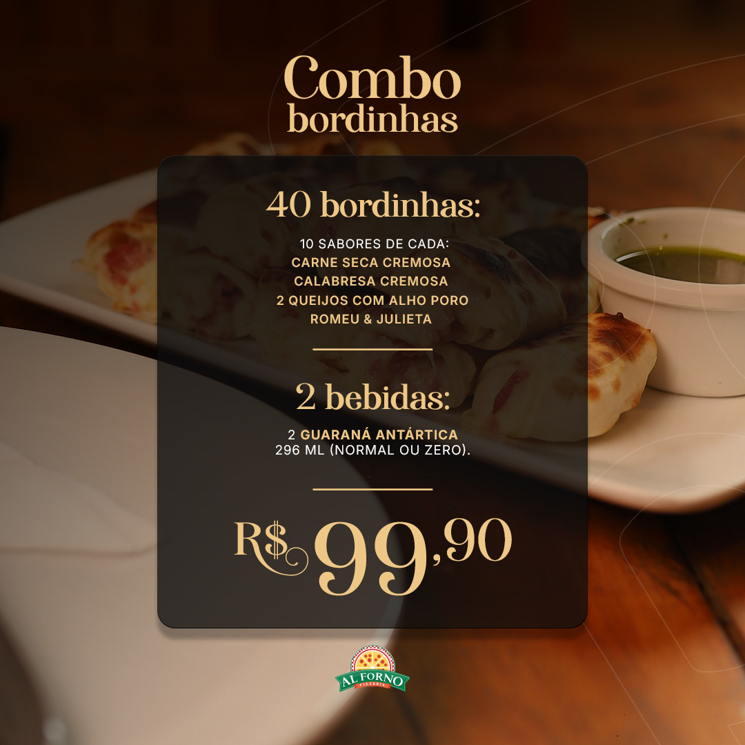 Este combo é composto por 40 unidades de Bordinhas! Sendo elas 10 bordinhas de calabresa cremosa, 10 bordinhas de carne seca cremosa ,10 frango com crean chease , e 10 bordinhas de Romeu e Julieta.