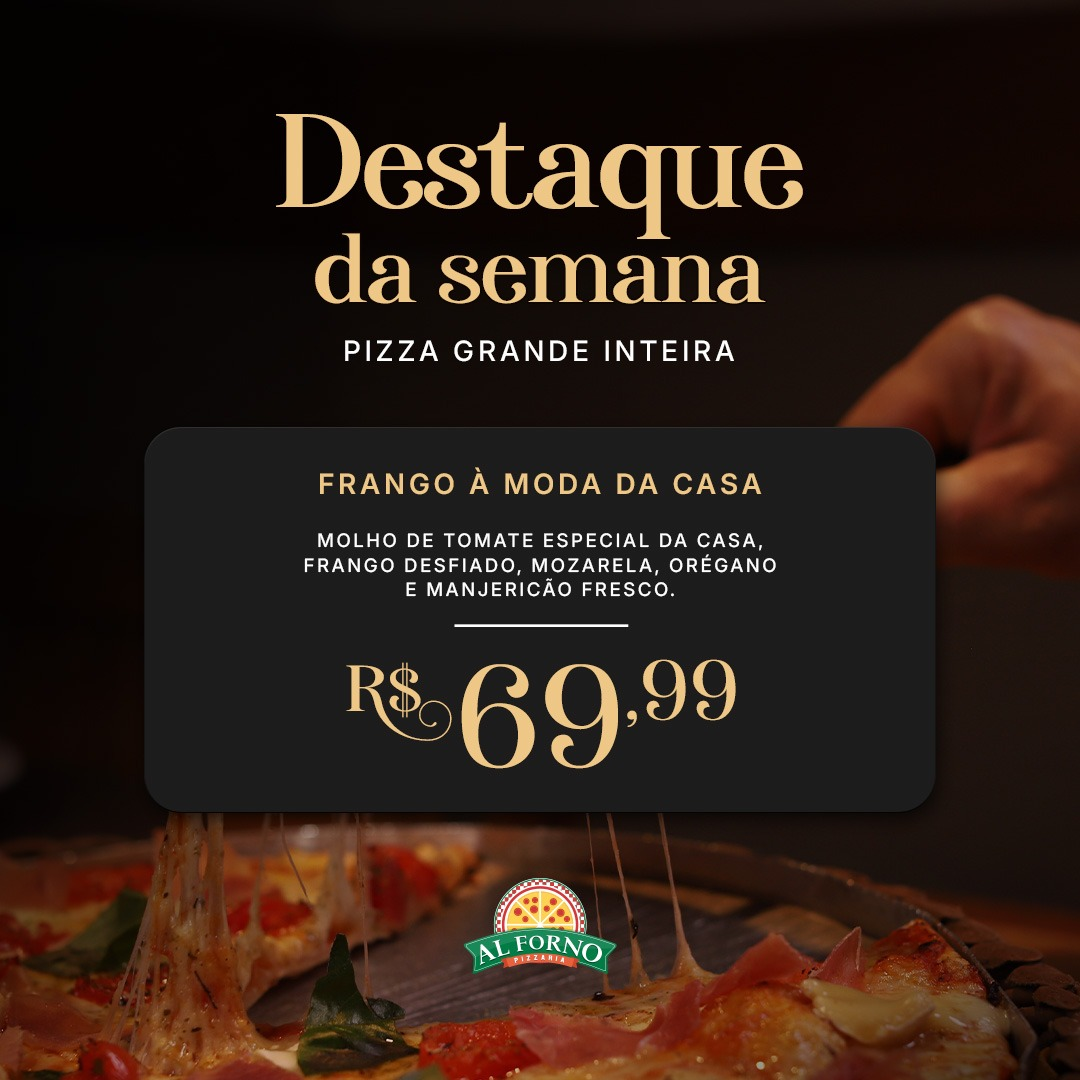 Molho de tomate especial da casa, frango desfiado, bacon,mozarela, orégano e manjericão fresco.