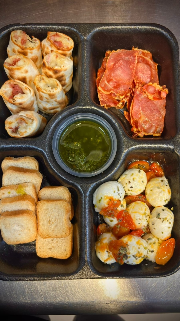 Bordinhas de calabresa Chips de Presunto de Parma Torradas Bufala perline com tomate confit Pesto de manjerição (Imagem ilustrativa)