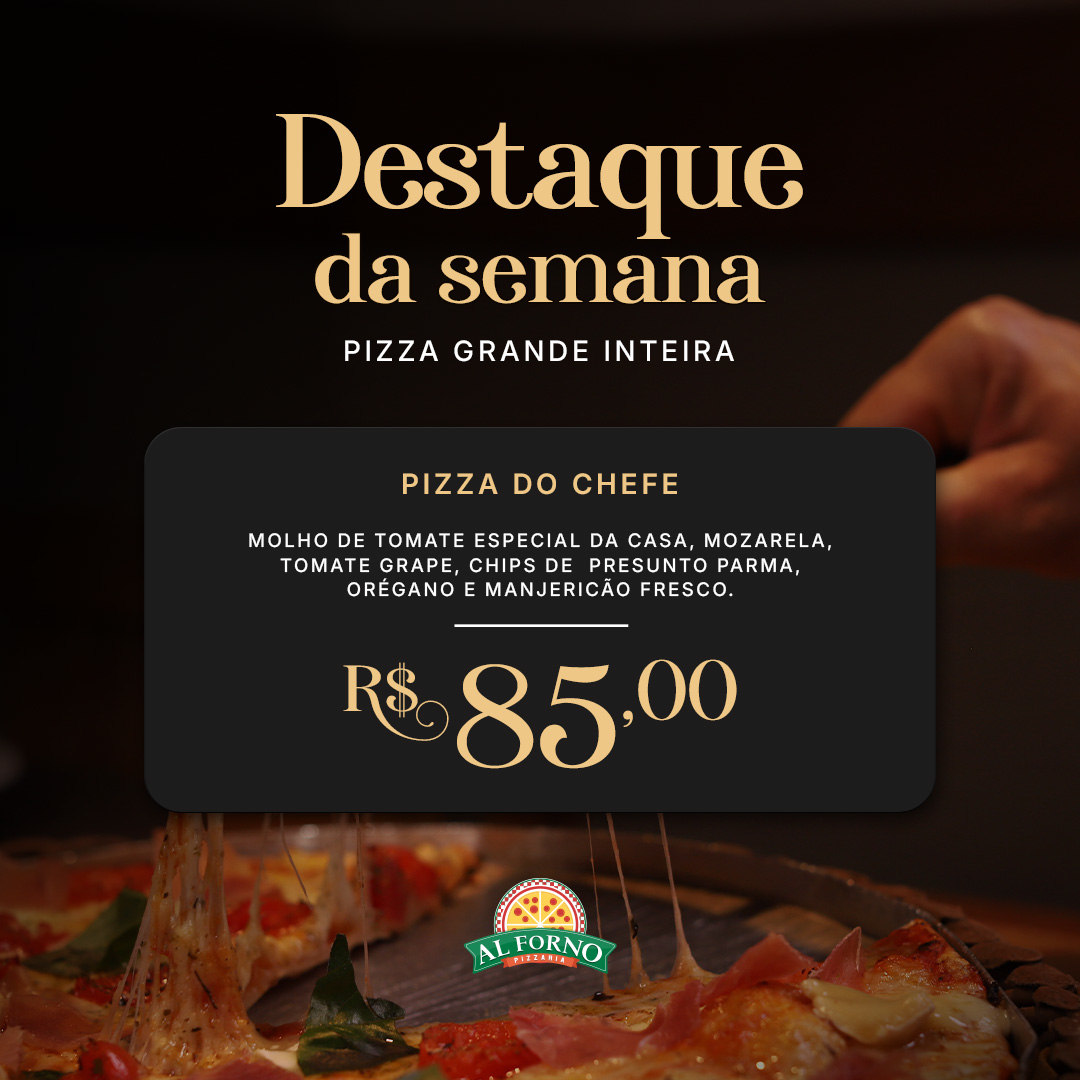 Pizza Grande composta por 35cm e 8 fatias! Molho de tomate especial da casa, mozarela, tomate grape, chips de presunto parma, orégano e manjericão fresco. (Imagem Ilustrativa)